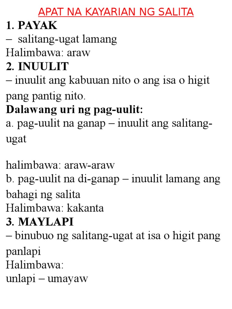 PANLAPI Sa paksang ito matutuklasan natin ang mga panlapi ang kahulugan mga tatlong uri at ibat ibang halimbawa nga bawat isa. Book Uri ng Panlapi Unlapi Gitlapi Hulapi kabilaan Laguhan UNLAPI halimbawa. May dalawang anyo ng pag-uulit ng mga salita.