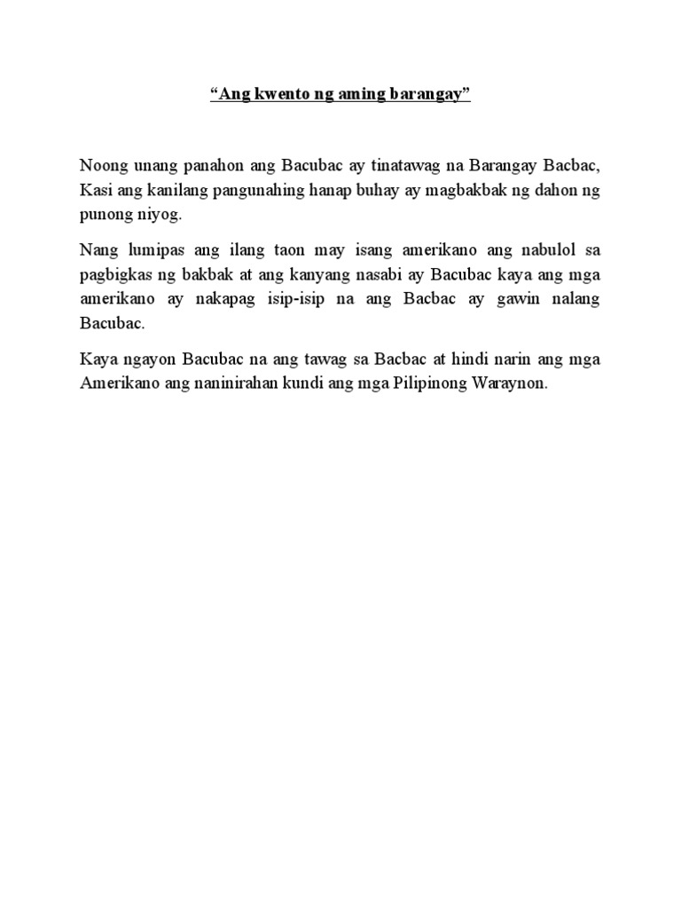 ALAMAT NG BARANGAY CENTRAL PAYAK NGUNIT TANYAG Noong unang panahon ayon sa ilang matatanda mabibilang mo lamang sa iyong mga daliri ang mga taong nakatira sa pook na kung tawagin ay CENTRAL. Mga sanhi at epekto nito 3. Ayon sa alkalde ito ay para mahikayat ang mga barangay sa pagpapanatili ng laban sa COVID-19.