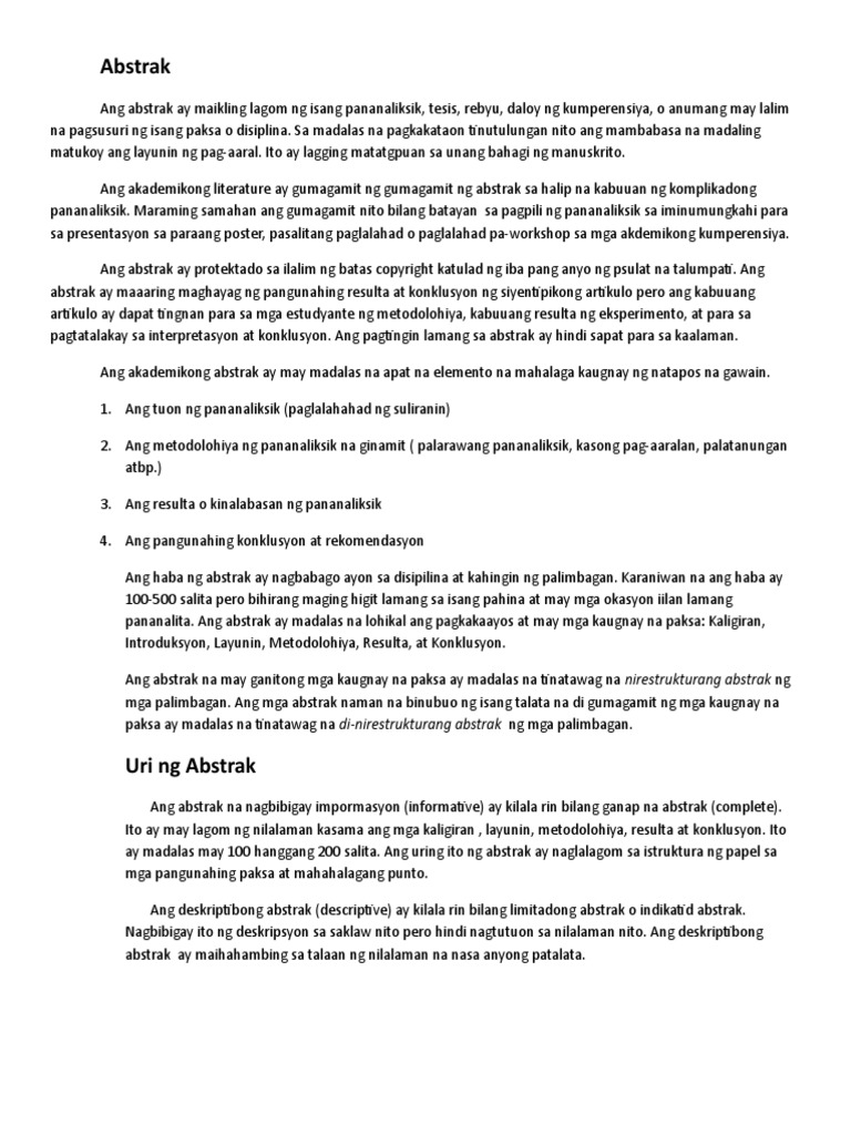 Ang Abstrak ay isang uri ng lagom na ginagamit sa pagsusulat ng mga akademikong papel academic papers. Masdan kung papaano nagbibigay ang abstrak ng isang maikling buod ng akademikong sulatin. Hanapan ang Blog na Ito.