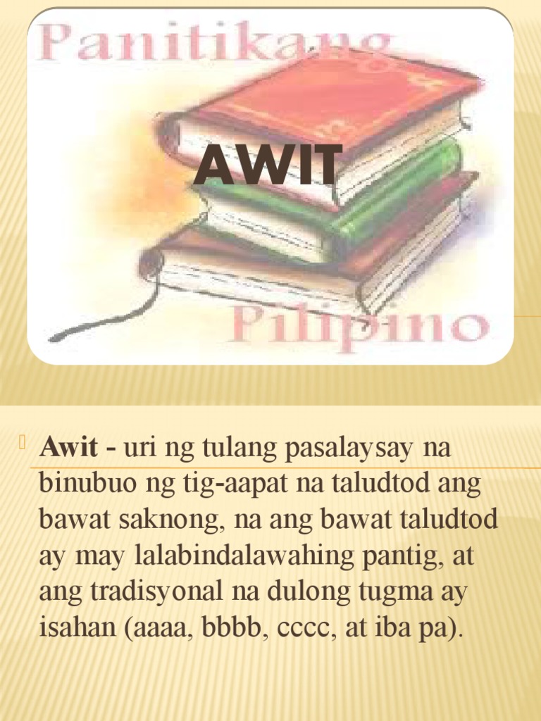 Karaniwang mahaba at may mahusay na banghay ng mga pangyayaring isinasalaysay. Ang isa pang sanga ay tinatawag na awit. Mga Uri ng Tulang Lumaganap sa Panahon ng mga Espanyol 3.