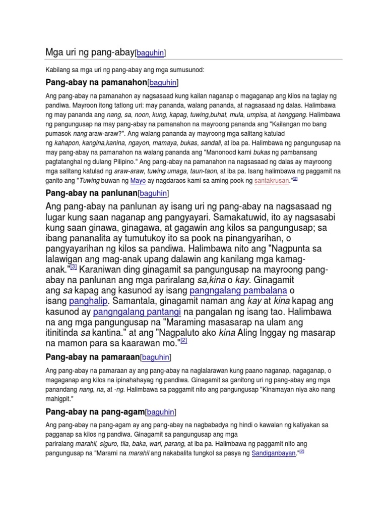 Bilon By Gloricelbibat123 On Emaze. Sinasagot ng mga pang-uri ang tanong Paano ito pupunta o paano ito Halimbawa. URI NG PANG-ABAY Pamanahon May pananda - nang sa noon kung kapag tuwing buhat mula umpisa at hanggang Walang pananda - kahapon kanina ngayon mamaya bukas sandali at iba pa Nagsasaad ng dalas - araw-araw tuwing umaga taun-taon at iba pa 1.