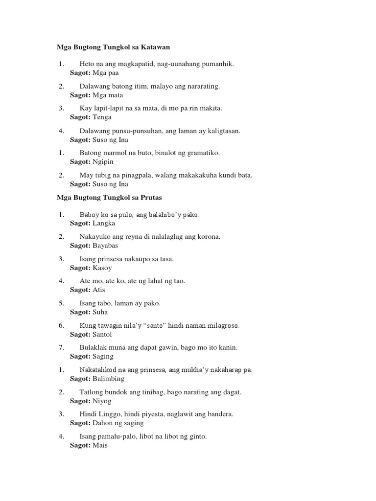Halimbawa ng bugtong sa bisaya. Here are some examples of the most famous Tagalog Riddles and their answers.
