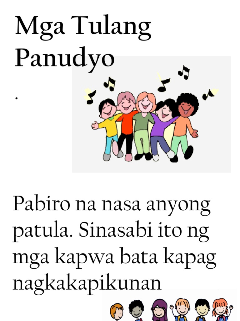 Awit tulang panudyo d. Kapag maganda ang tanawin mararaming mga turistang nakatingin at bibigyan ng pansin. Sumulat ng sariling tulaawiting panudyo tugmang de gulong bugtong o palaisipan batay sa mga pamantayan.