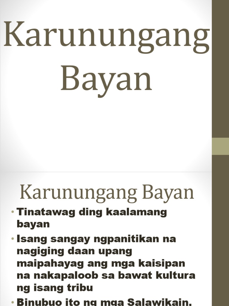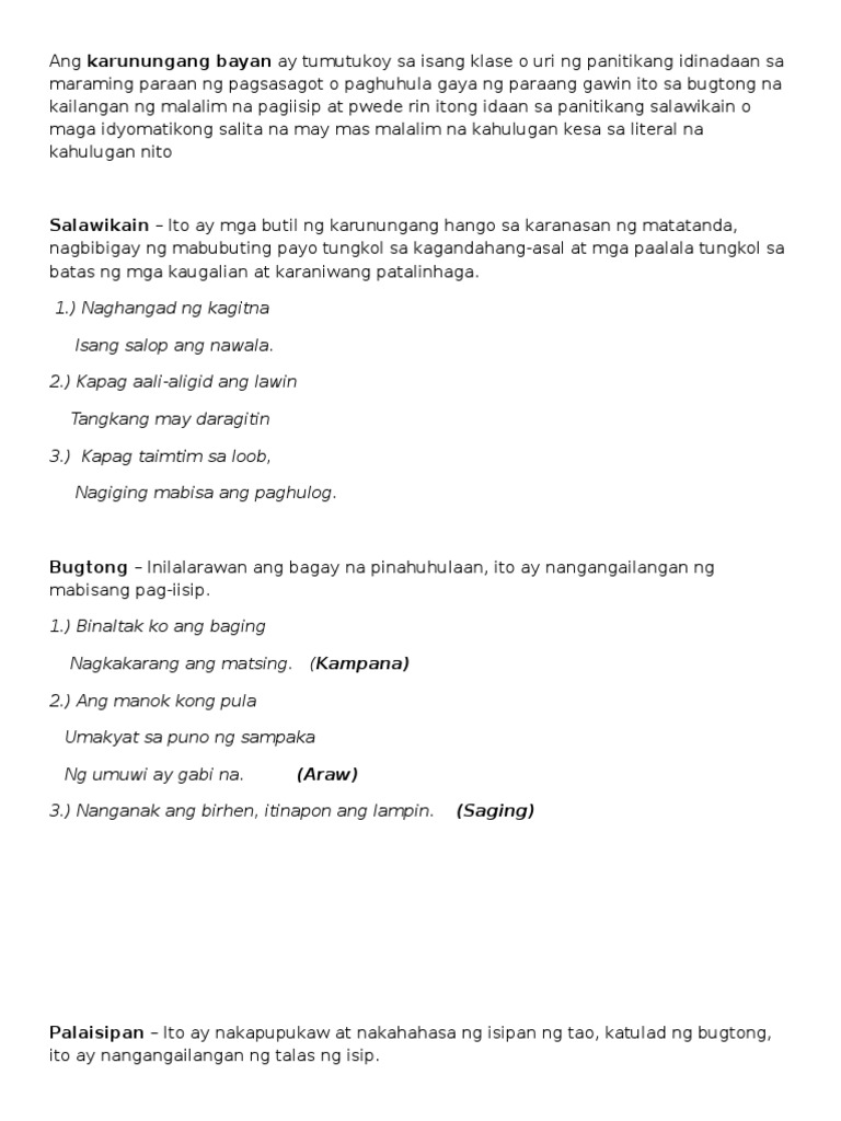 Pagkatapos nung lumaki na at nagkapamilya ang mga batang ito naipapasa nila ito sa kanilang mga anak. Karununang-bayan Binubuo ng bugtong sawikain salawikainkawikaanidyomakasabihanat palaisipan. Ngunit ito rin ay masasabi para sa mga palaisipan.