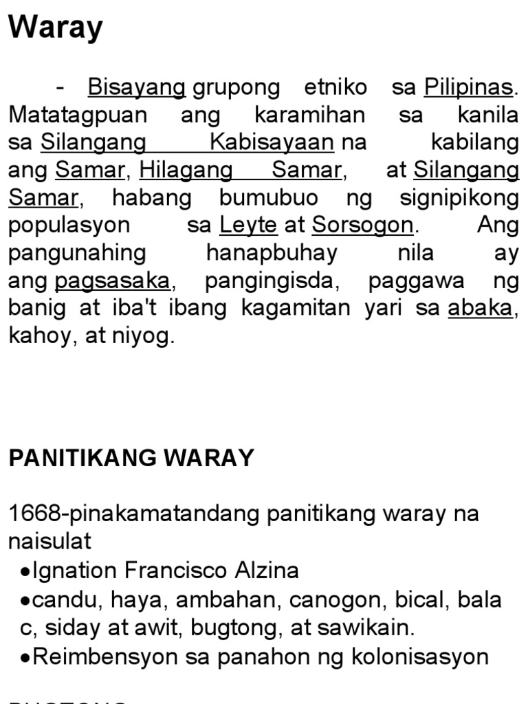 Ang pinagmulan ng mga bugtong. Results for mga halimbawa ng salitang waray translation from Tagalog to English. O ng bugtong na itong Waray tungkol sa mga bituin.