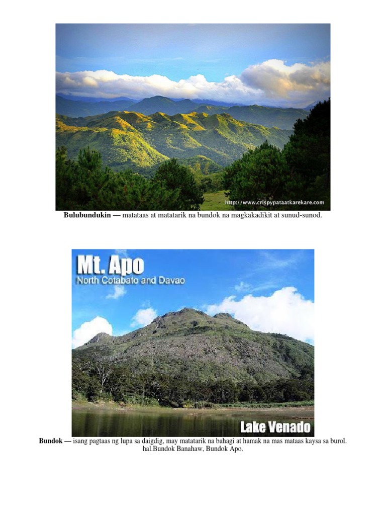 Bundok isang pagtaas ng lupa sa daigdig may matatarik na bahagi at hamak na mas mataas kaysa sa burol. - pinaka-malalim na lawa sa daigdig. Mga Anyong Tubig sa Pilipinas 1.