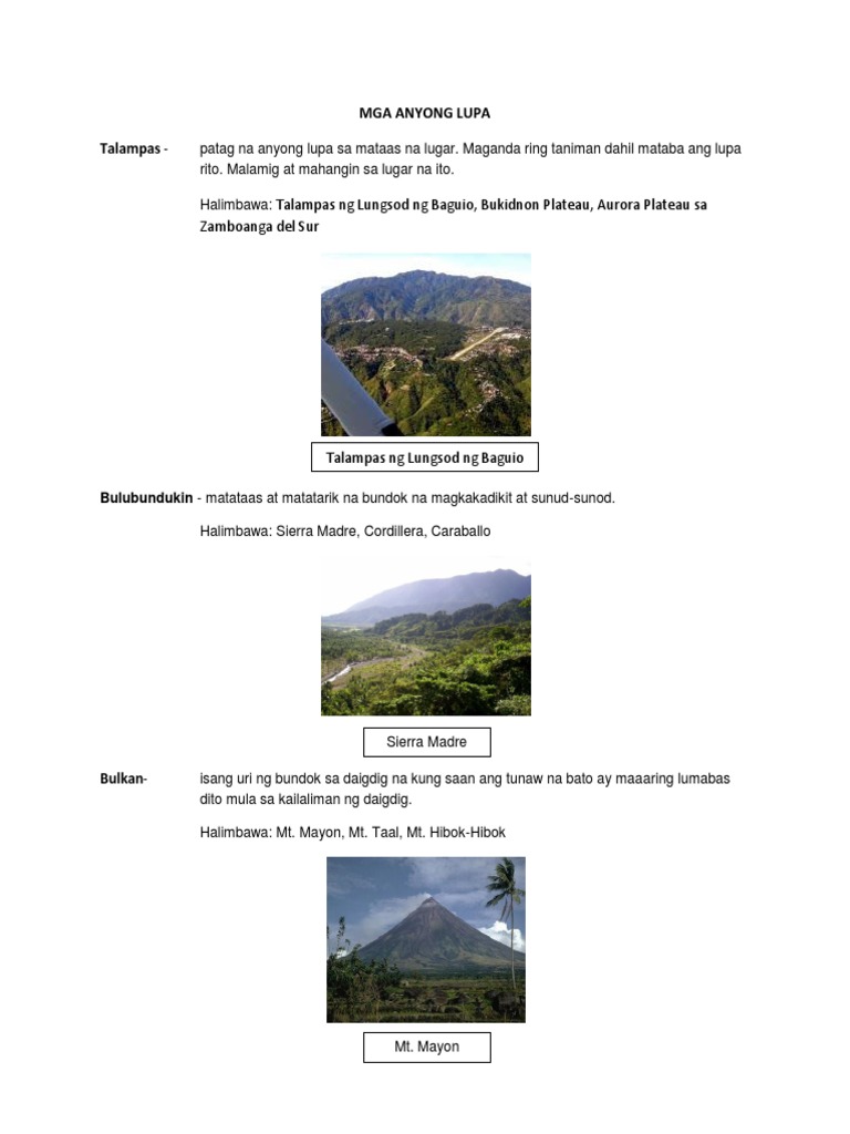 Bulkan Ito ay isang uri ng bundok sa daigdig na kung saan ang tunaw na bato ay maaaring lumabas dito mula sa kailaliman ng daigdig. Kapatagan - isang malawak at mababang masa ng lupa ang kapatagan. Isang halimbawa nito ay ang kapatagan ng gitnang Luzon.