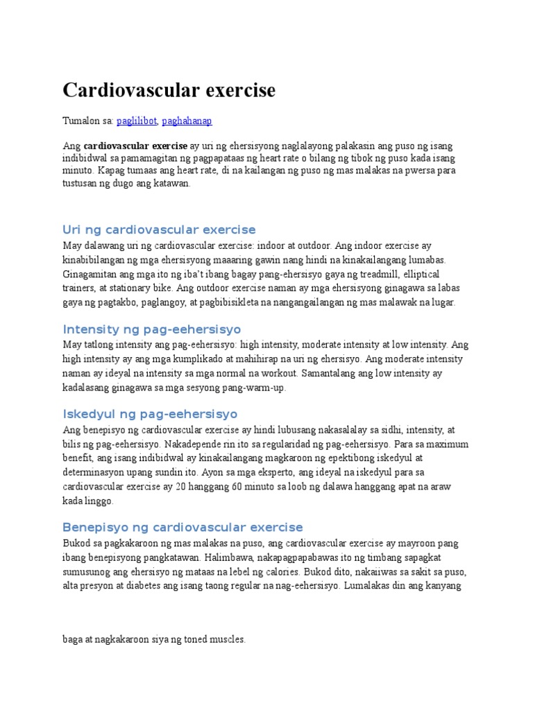 Halimbawa ng ehersisyo para sa cardiovascular endurance. Epekto Ang mga epekto ng Long Duration Cardio ay mas agarang. Ang ehersisyo kaugnay ng pagpapaunlad ng kalusugan ay ang alinmang gawaing pangkatawan na planado may kayarian at inuulit-ulit upang makamit ang layunin ng pagkukundisyon ng anumang bahagi ng katawan. Ang ilan sa mga halimbawa ng mga madadaling cardiovascular o aerobic exercises ay.