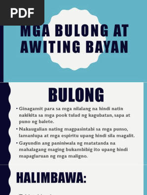 Mga halimbawa ng uri ng bulong na nagtataboy ng masasamang diwa o maligno ay ang Xristac Ortac Aminatac at umalayu deketam e pesan a ore ni kamalotan de tabiang ni makedepatHalimbawa ng isang bulong ay Tabi tabi po. View Test Prep - FILIPINO-REPORT_BULONG-BULONGAN__BINTANA-NG-HALIMBAWA 1pptx from BACHELOR O 2000678 at Kalinga State University-Tabuk. Halimbawa ng mga bulong.