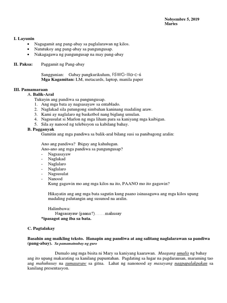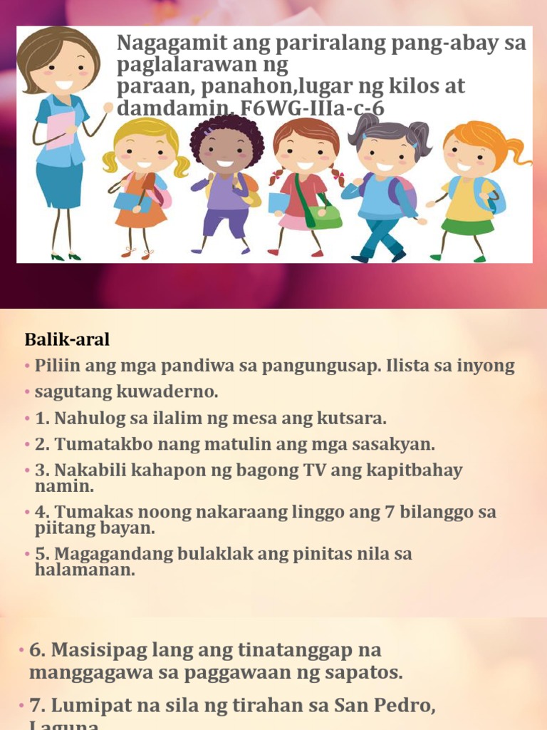 Fil6q3week1day2 Pptx Nagagamit Ang Pariralang Pang Abay Sa Paglalarawan Ng Paraan Panahon Lugar Ng Kilos At Damdamin F6wg Iiia C 6 Balik Aral U2022 Course Hero