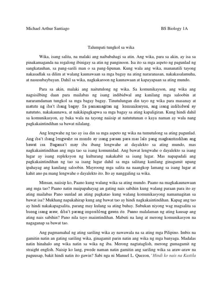 Ipagmalaki pagyamanin at gamitin natin ito kagaya ng ginawa n gating pambansang bayani na si Rizal na kahit marami na siyang alam na wikay taas noo parin niyang ginamit ang ating wikang Filipino sa kanyang mga obra kahit saan man siya pumunta. Filipino 29082020 0401 brianneaudreyvuy Halimbawa ng talumpati ayon sa wikang pilipino. Halimbawa ng isang talumpati tungkol sa wikang filipino.