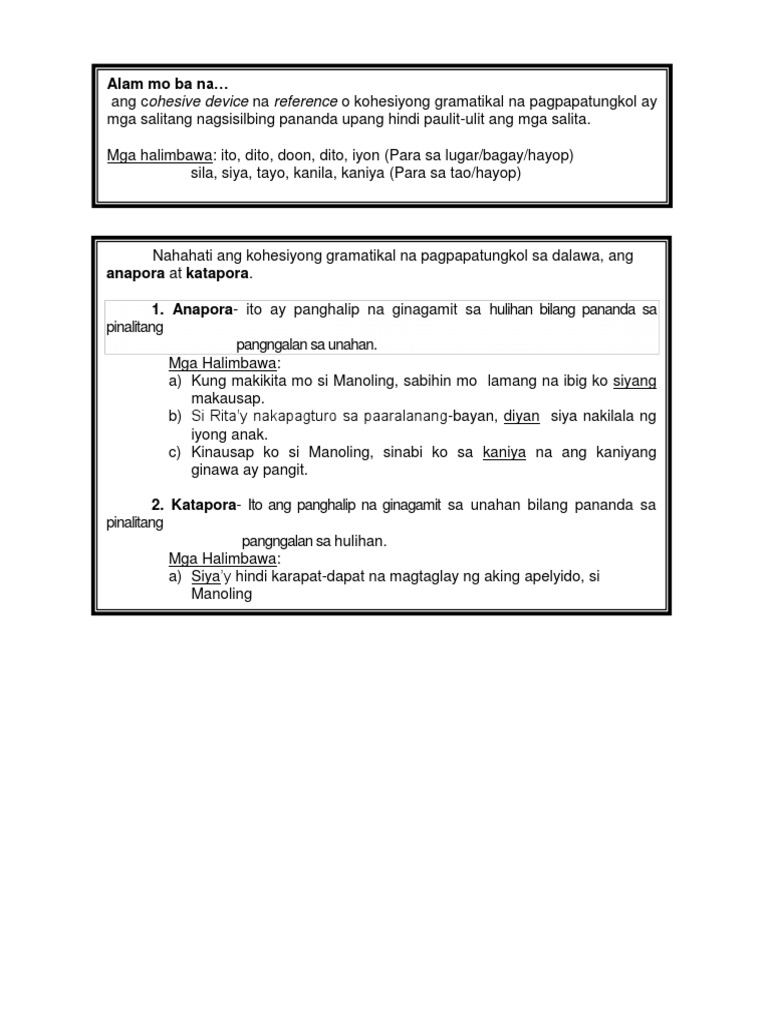 Dalawang uri ng reperensiya Anapora Kung kailangang bumalik sa teksto upang malaman kung sino o ano ang tinutukoy. GAMIT NG COHESIVE DEVICES - Upang maging mas mahusay ang pagkakahabi ng tekstong deskriptibo bilang bahagi ng iba pang uri ng teksto o kayay maging mas malinaw ang anumang uri. Ang Cohesive Device Reference o Kohesyong Gramatikal ay mga salitang nagiging pananda para hindi maging paulit ano ano ang cohesive devices magbigay ng tatlo.