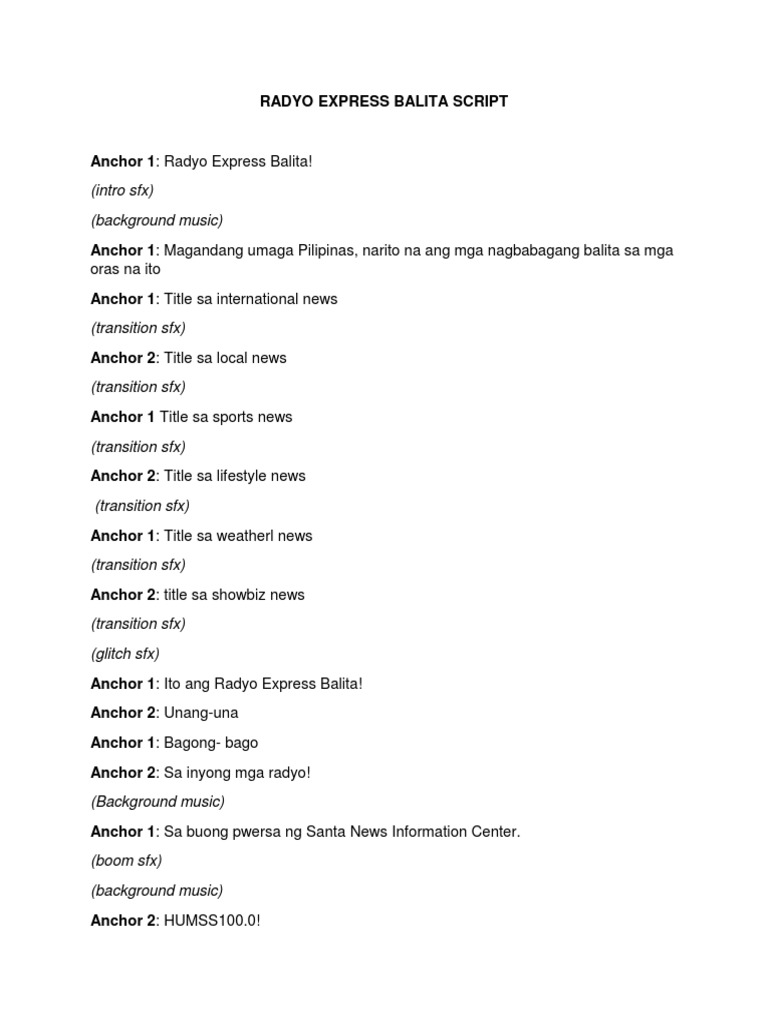 Abalos kinuwestiyun ang paglaya binatilyo patay sa insedente bangkay ng lalaki isinako holdaper ng pawnshop kilala na bakeshop hinoldap libong kinita natangay pinoy athletes naguwi ng karangalan sa pinas relasyong kris at aljur nabitin. SAMPLE SCRIPT RADIO NEWS BROADCAST Filipino Isinulat ni Allan A. It may also serve as an outline for future newscasts.