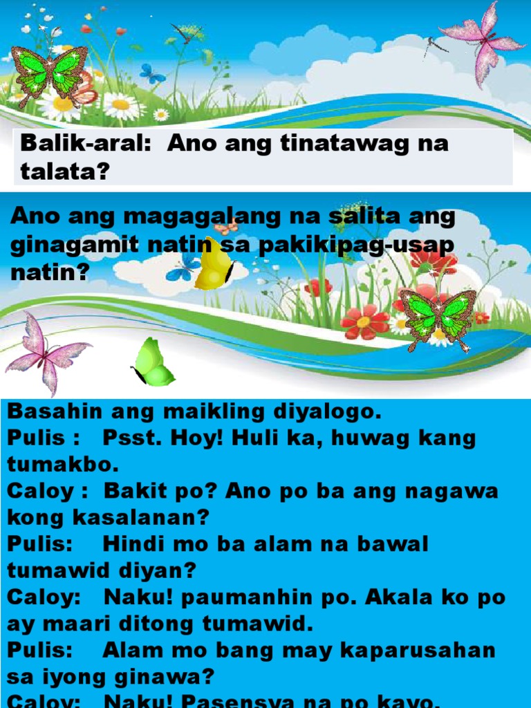 Halimbawa ng dayalogo gamit ang magagalang na salita. Learn vocabulary terms and more with flashcards games and other study tools. Isang umaga nakasalubong mo ang iyong guro sa pagpasok mo sa paaralan. 5Bilang isang bata at mag-aaral paano ninyo kakausapin ang isang pulis kung kayo ang nasa sitwasyon ni Caloy.
