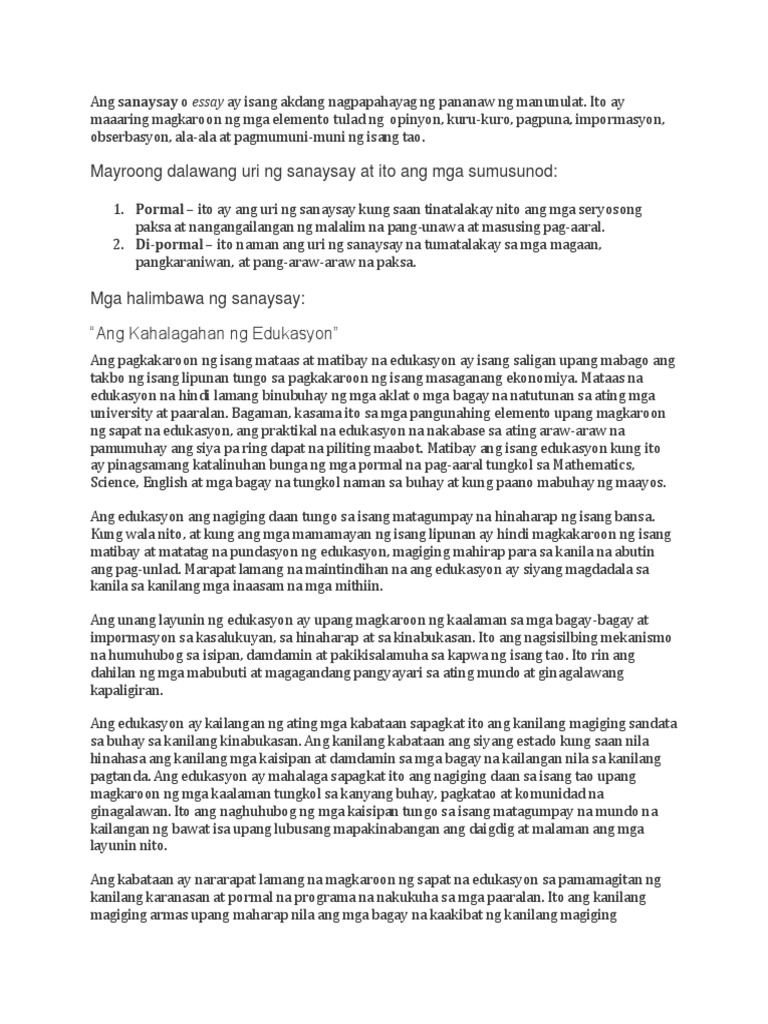 Pwede itong maikli o mahaba. Halimbawa Ng Di Pormal Na Sanaysay Tungkol Sa Edukasyon. Ang Kahalagahan ng Edukasyon Tagalog na Sanaysay Ang pagkakaroon ng isang mataas at matibay na edukasyon ay isang saligan upang mabago ang takbo ng isang lipunan tungo sa pagkakaroon ng isang masaganang ekonomiya.