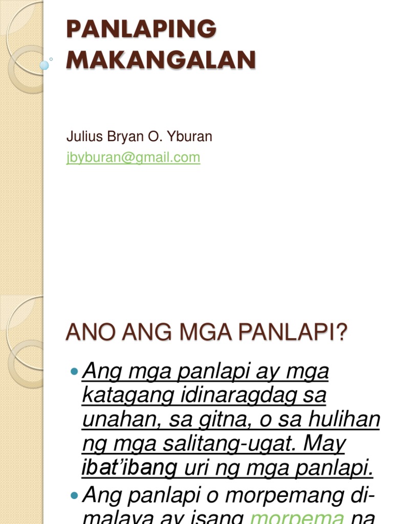 Ang Panlapi ay ang mga idinadag na mga letra sa isang salitang-ugat. Pang baril pam baril pamaril pang palo pam palo pamalo pang takot pan takot panakot pang tali pan tali panali 3. The second was about tambalang salita or filipino compound words.