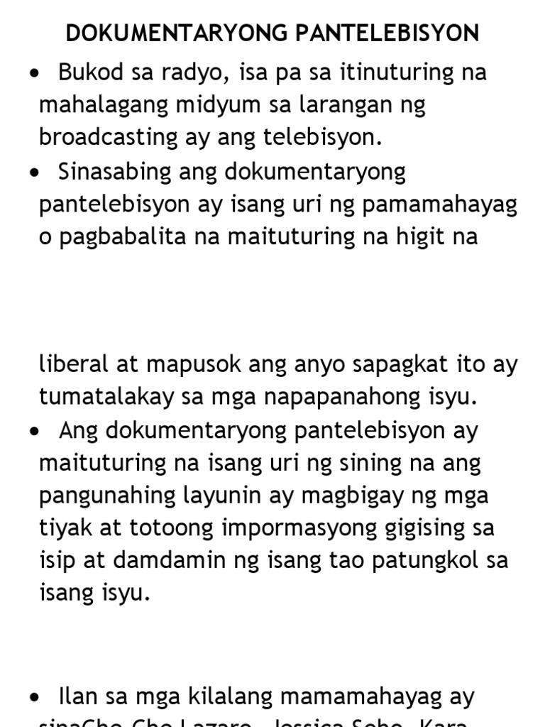 Panooring mabuti ang dokumentaryong Pantelebisyon ni Howie Severino na may. Itoy mahalaga at mabisang sangay ng kabatirang panlipunan pang-ispiritwal pangkultura pangmoralidad pang edukasyon at iba pa. Tungkol sa katotohanan at realidad na pangyayari sa buhay at sa lipunan.