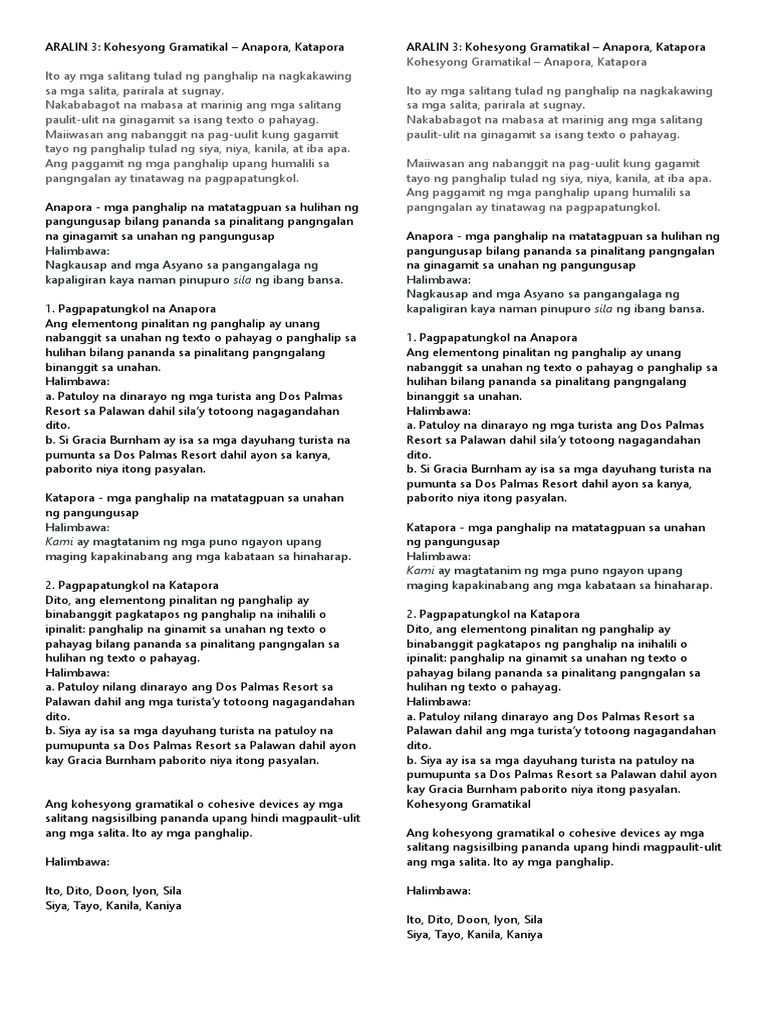 31-3-2011 Mga Halimbawa ng Anapora at Katapora - Download as Word Doc doc docx PDF File mga halimbawa ng cohesive devices sa aralin 4 ng Filipino IV. Cohensive Devices Kohesyong Gramatikal Anapora Katapora Ito ay mga salitang tulad ng panghalip na nagkakawing sa mga salita parirala at sugnayNakababagot na mabasa at marinig ang mga salitang paulit-ulit na ginagamit sa isang texto o pahayag.