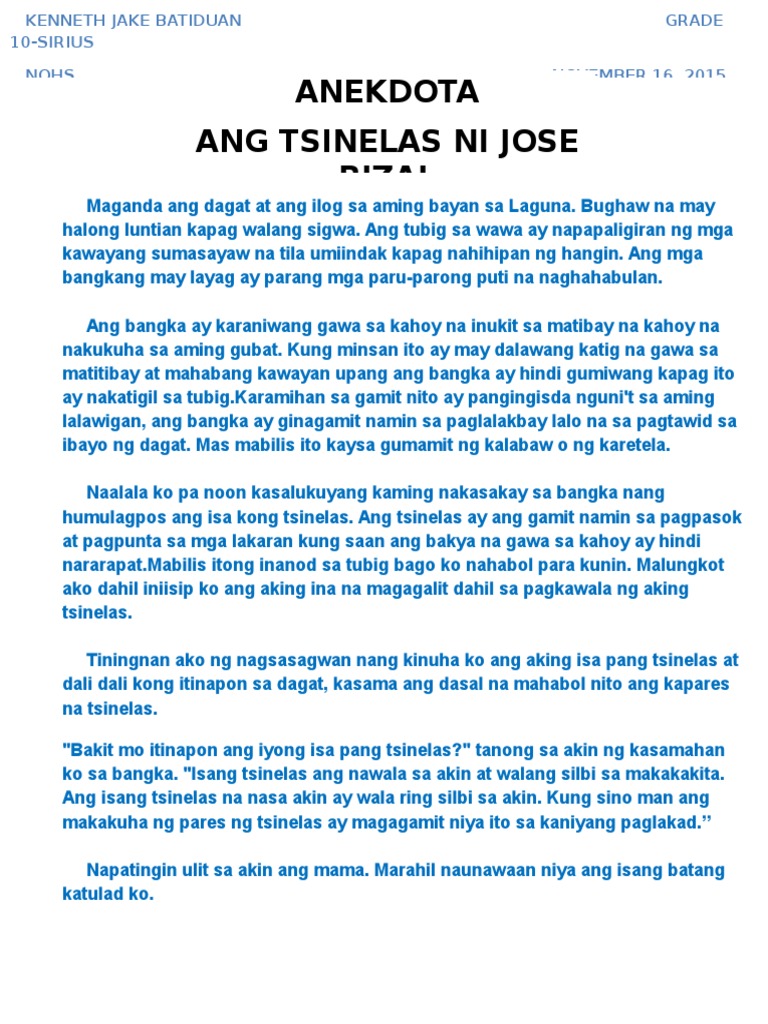 Ito ay isang uri ng akdang tuluyan na tumatalakay sa nakakatawa o kakaibang pangyayari o insidente. Unang nag-aral si Rizal sa kanyang bayan sa Calamba Laguna. Nag-aral ako ng mabuti dahil ito lang ang paraan na naiisip ko upang mapagbigyan ako ng aking ina sa aking hiling.