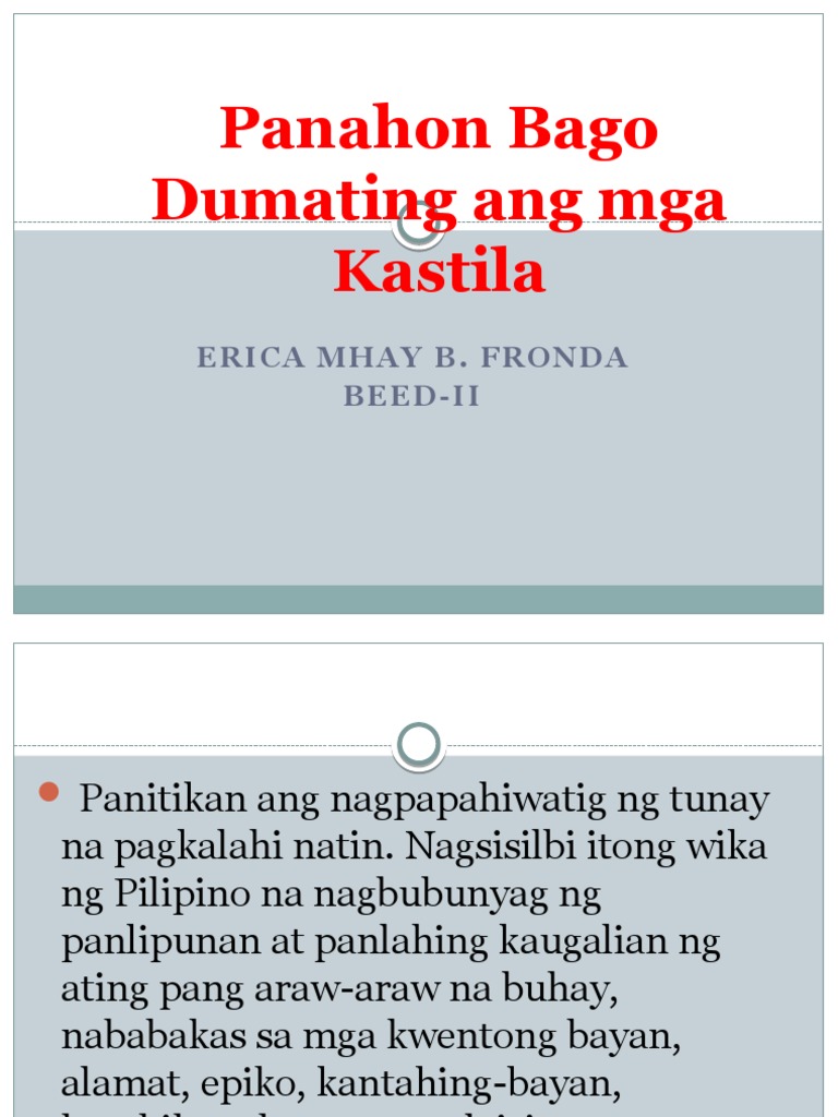 Bago pa man dumating ang mga Kastila noong unang panahon ang mga Negrito o Ita Intsik Persiano Bumbay Malacca Indones at Malay ang siyang mamamayan ng Pilipinas. PANITIKAN BAGO DUMATING ANG MGA KASTILA. You just studied 22 terms.
