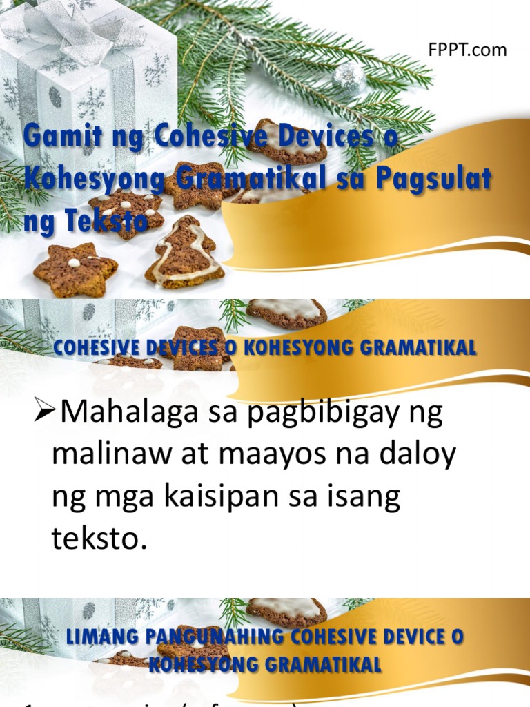 View Notes - pagbasa1111pptx from BIO 101 at Holy Trinity School. GAMIT NG COHESIVE DEVICES O KOHESYONG GRAMATIKAL SA PAGSULAT NG TEKSTONG DESKRIPTIBO Mayroong limang pangunahing cohesive device o kohesyong gramatikal ay ang sumusunod. Ito ay halimbawa ng.