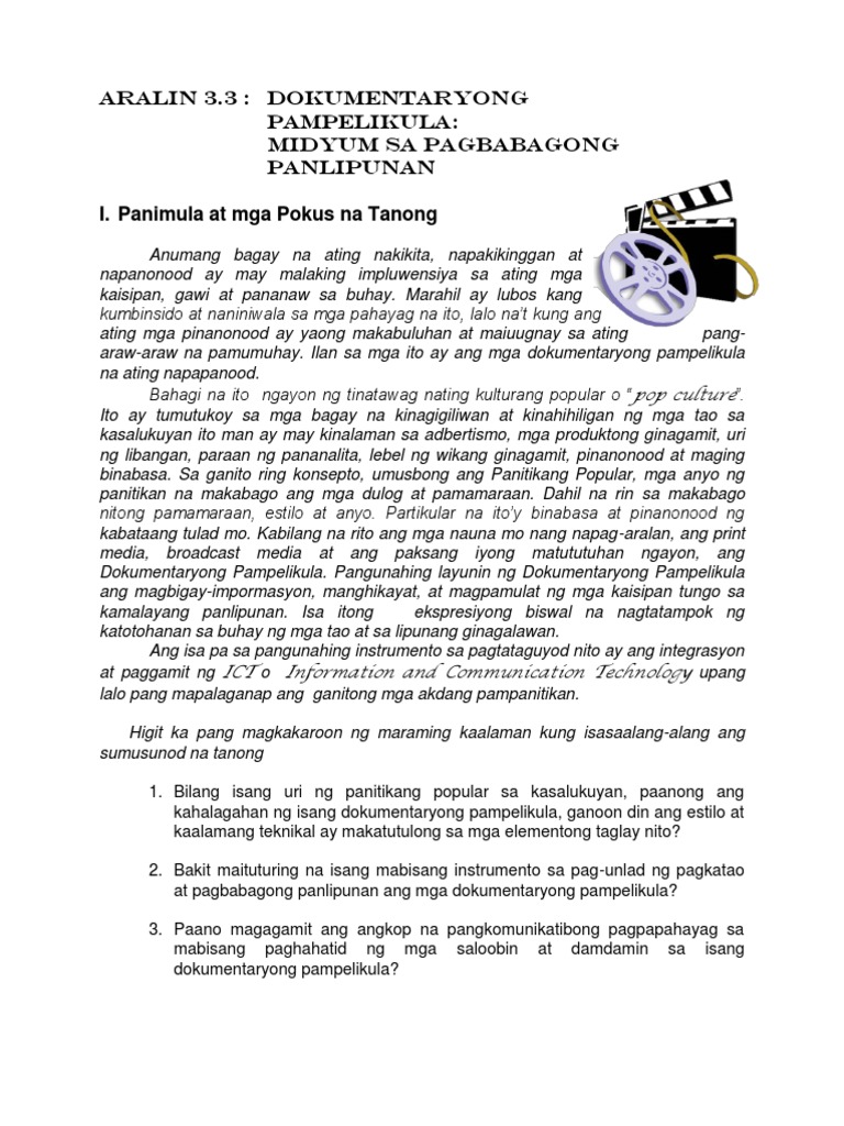 Dokumentaryong Pantelebisyon by Cherry Tapia on Prezi. Mutya ng Masa. Ang isang mabuting halimbawa ng ganitong uri ng dokumentaryo ay Hot CoffeeSinisiyasat ng pelikulang ito ang kwento ng babae na nagsampa ng demanda laban sa McDonalds matapos ang pag-iwas ng kape at iba pang katulad na mga kwento na nagpapakita kung paano ang media at mga pulitiko na may higit sa umuusbong na interes ay pinagsama ang lahat.