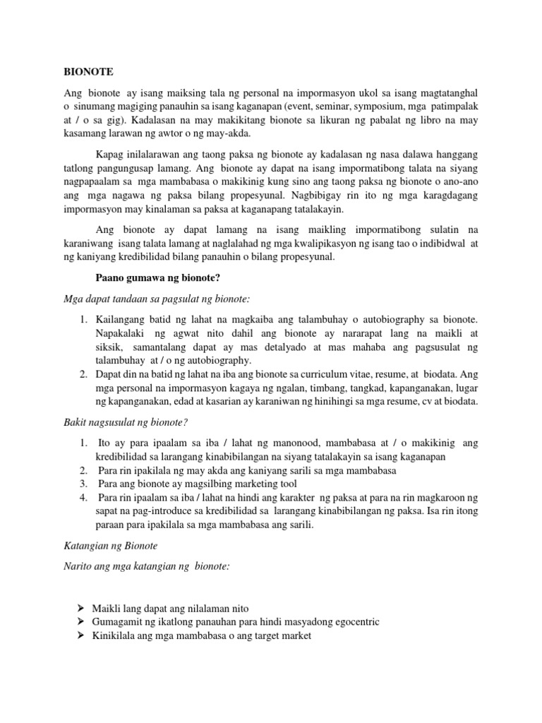 Halimbawa Ng Bionote Sa Sarili Pdf