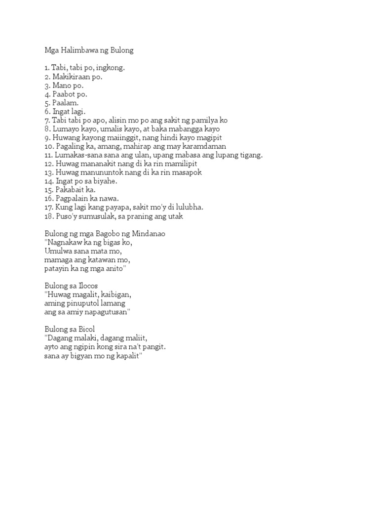 Mga Halimbawa Ng Bulong Mga Halimbawa Ng Bulong Ang Bulong Ay Isang Matandang Katawagan Sa Orasyon Ng Mga Sinaunang Tao Sa Kapuluan Ng Pilipinas Sa Course Hero