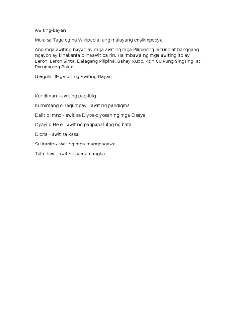 Awiting bayan mga awiting sumasalamin sa araw araw na pamumuhay ng mga katutubo at mamamayan ng pilipinas nagkukuwento tungkol sa mga katutubo lalo na sa mga probinsya sa kanilang simpleng pamumuhay isa sa matandang uri ng panitikang filipino na lumitaw bago pa man dumating ang mga kastila ang mga wika na sumasaklaw sa panitikang bisaya. 7 Dignity Diligence Hope Bravery Hope Agosto 21-31 2017 ARALIN 21 A. Sa kasalukuyan ang salitang ito ay may iba nang kahulugan sa wikang Tagalog ng Maynila subalit nanatili pa rin ang tunay na pakahulugan nito sa ilang mga lalawigan sa Katagalugan Kabisayaan at Kabikulan.