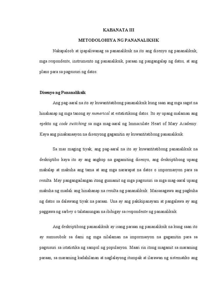 WM Weighted Mean N Kabuuang bilang ng mga respondent Scale Kahulugan 234 - 300 Lubos na Sumasang-ayon 167 - 233 Sang-ayon 100 - 166 Hindi Sang-ayon Talaan ng mga Salik na Nakaaapekto sa. Modelong halimbawa ng PAMAMARAAN NG PANANALIKSIK Kabanata 3 METODOLOHIYA NG PANANALIKSIK Inilahad sa kabanatang ito ang mga pamamaraang ginamit sa pag-aaral at paglalarawan sa mga hakbang na isakatuparan sa pagsusuri at pagpapakahulugan nnng mga walong pangunahing wika at wikang cultural.