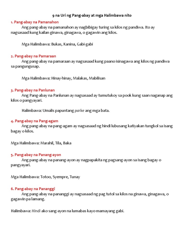 Ano Ang Pang Abay Halimbawa Ng Pang Abay At Mga Uri Nito