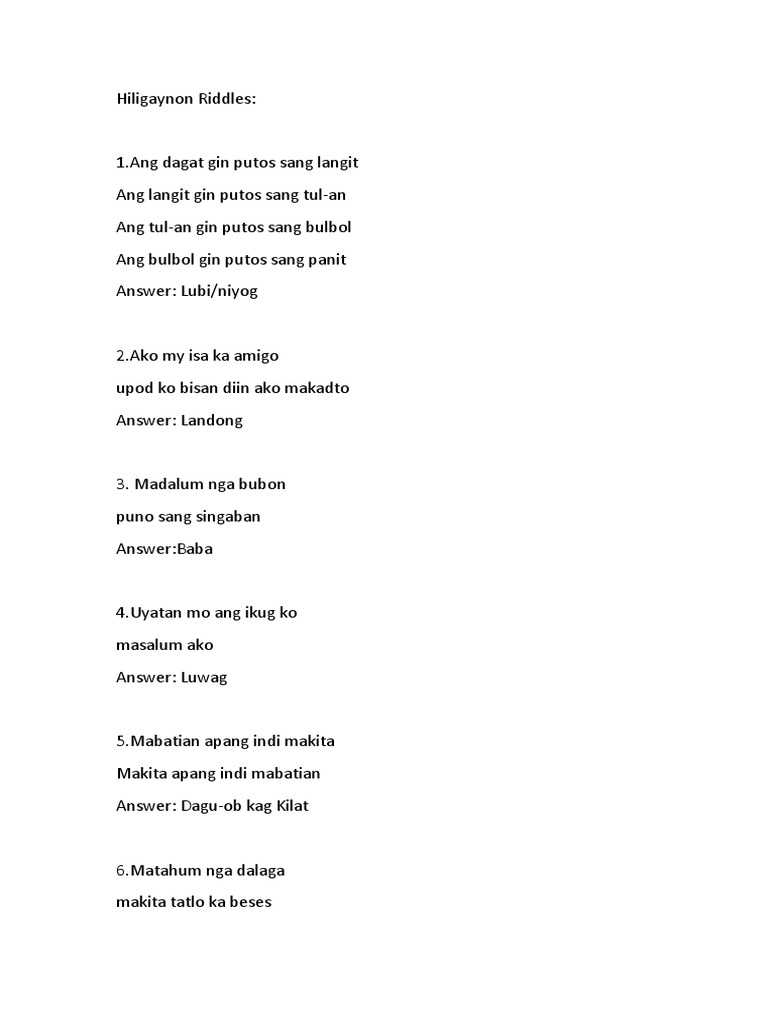 Filipino Riddles Collection Hubpages. Hiligaynon is the lingua franca of the West Visayas in Central Philippines.