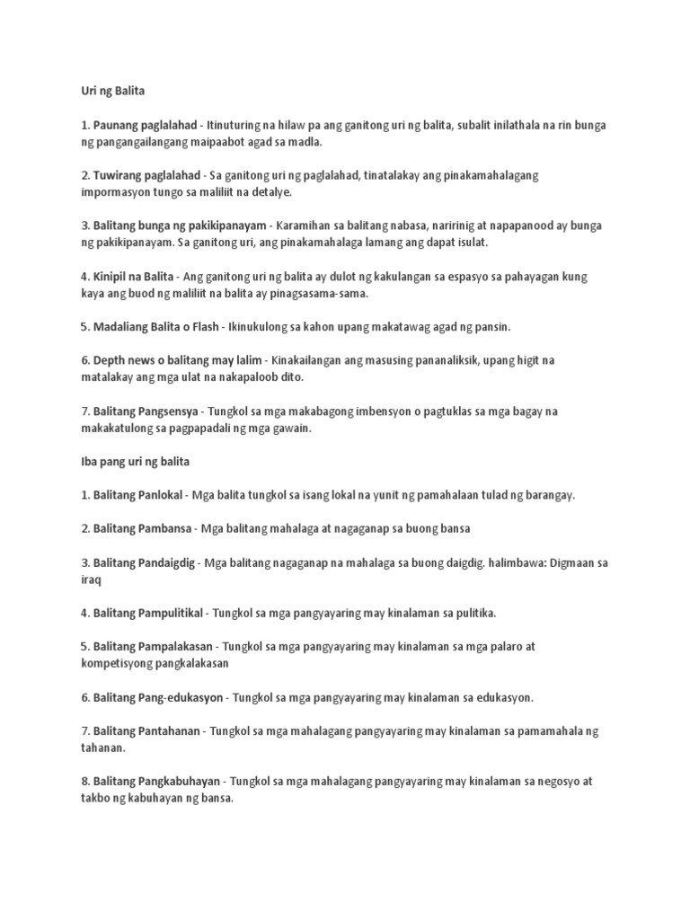 Naglalarawan ito sa atingkalagayan at maaaring maisulat sa pahayagan. HEADLINE NEWS NGAYON MGA DATING KAALYANSA NI DATING PANGULONG. NARITO NA NAMAN PO ANG RADYO BALITA NGAYON UPANG.