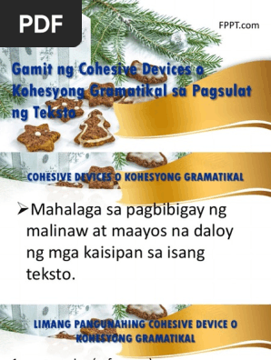 Reperensiya Reference Ang cohesive device na ito ay ang paggamit ng mga salitang maaring tumukoy sa paksang pinag-uusapan. Kohesyong gramatikal at uri ng pang abay. Ex cohesive devices 5 sentece new year resolution.